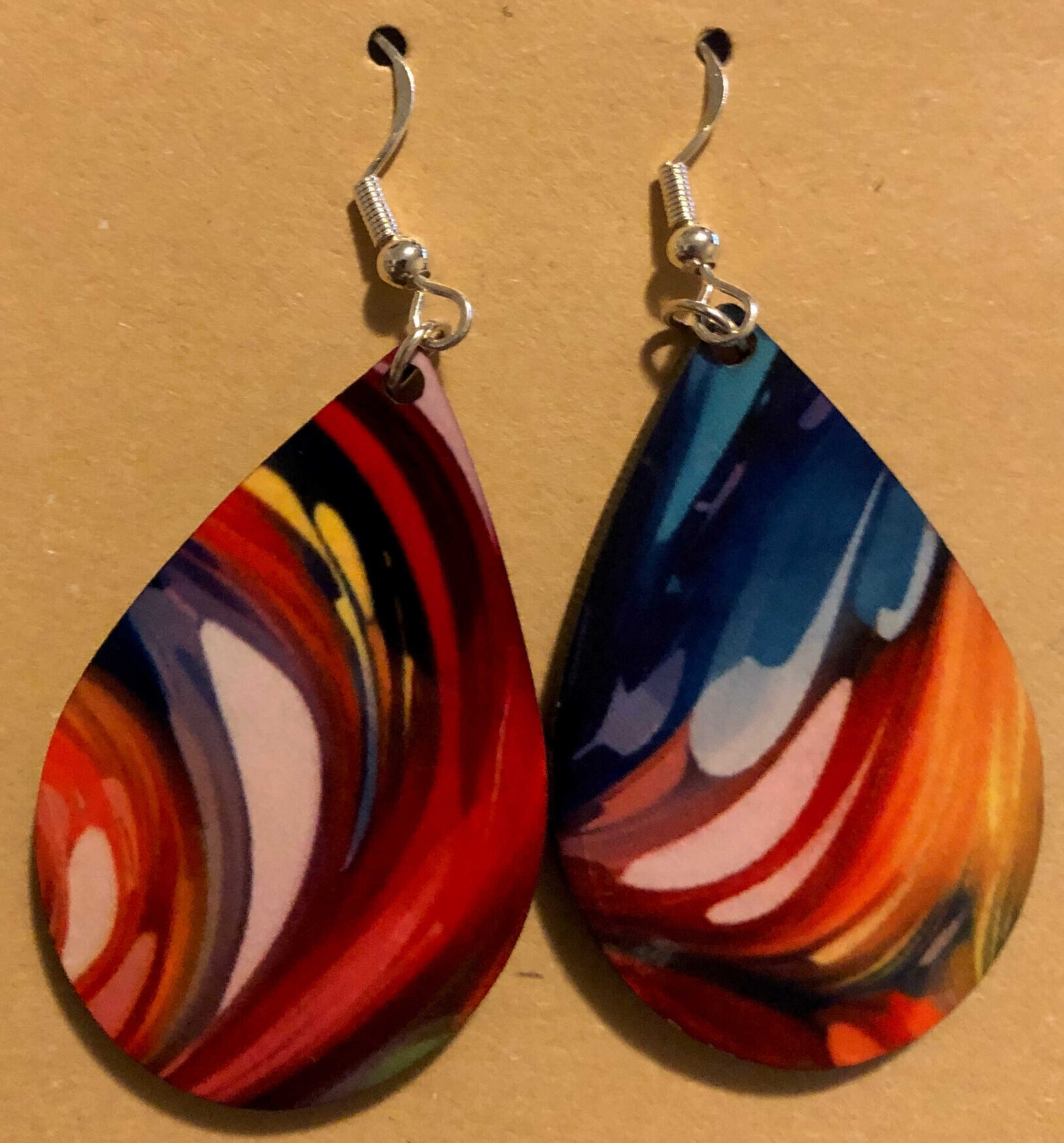 A pair of Ear Rings with an abstract multi-colored marble designs with sterling silver hardware.