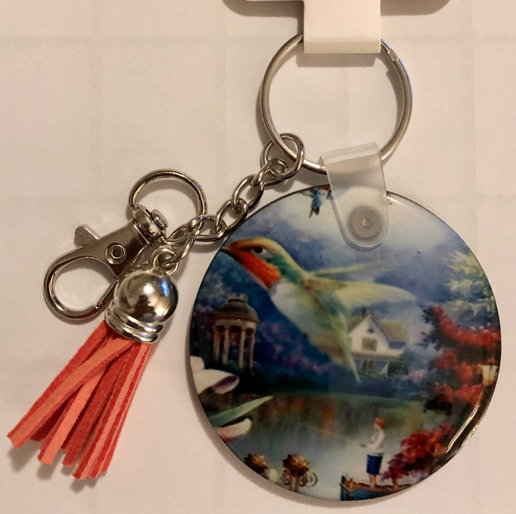 Key Ring with humming bird design. Shape: round Finish: acrylic coated