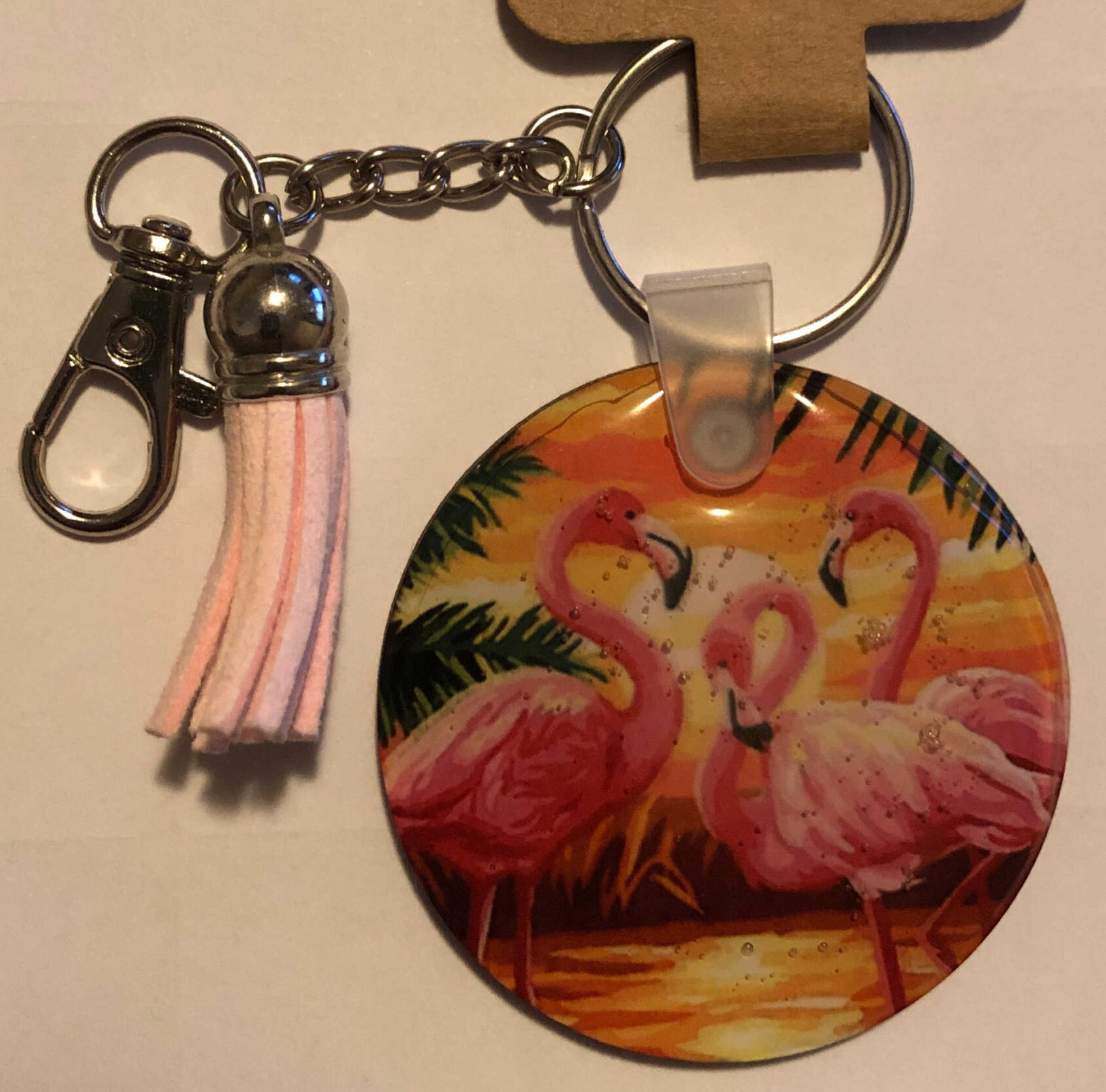 Key Ring with flamingo design. Shape:round Finish: acrylic coated.